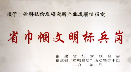 大會(huì)表彰了全國(guó)和省巾幗建功標(biāo)兵、巾幗文明標(biāo)兵崗、巾幗文明崗。我所產(chǎn)業(yè)發(fā)展情報(bào)室榮獲“福建省巾幗文明標(biāo)兵崗”和“福建省巾幗文明崗”榮譽(yù)稱號(hào)。所黨總支書記高一真代表我所產(chǎn)業(yè)發(fā)展情報(bào)室登臺(tái)領(lǐng)獎(jiǎng)。