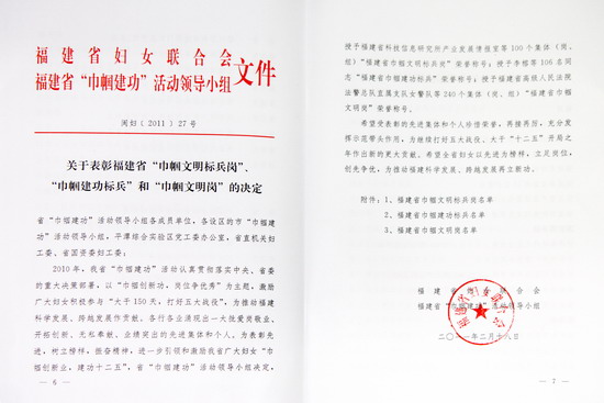 榮獲“福建省巾幗文明標(biāo)兵崗”和“福建省巾幗文明崗”榮譽(yù)稱號(hào)