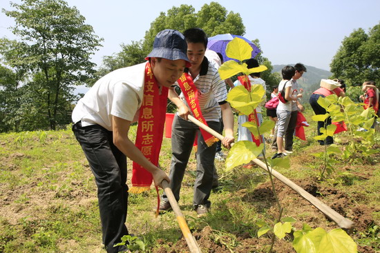 上午10點左右植樹活動開始,大家小心翼翼地為一株株幼小的桑樹苗挖坑、填土、踩實、澆水,忙的不亦樂乎。近一個小時的工作,雖然有些疲憊,每個人臉上卻洋溢了滿足的笑容。